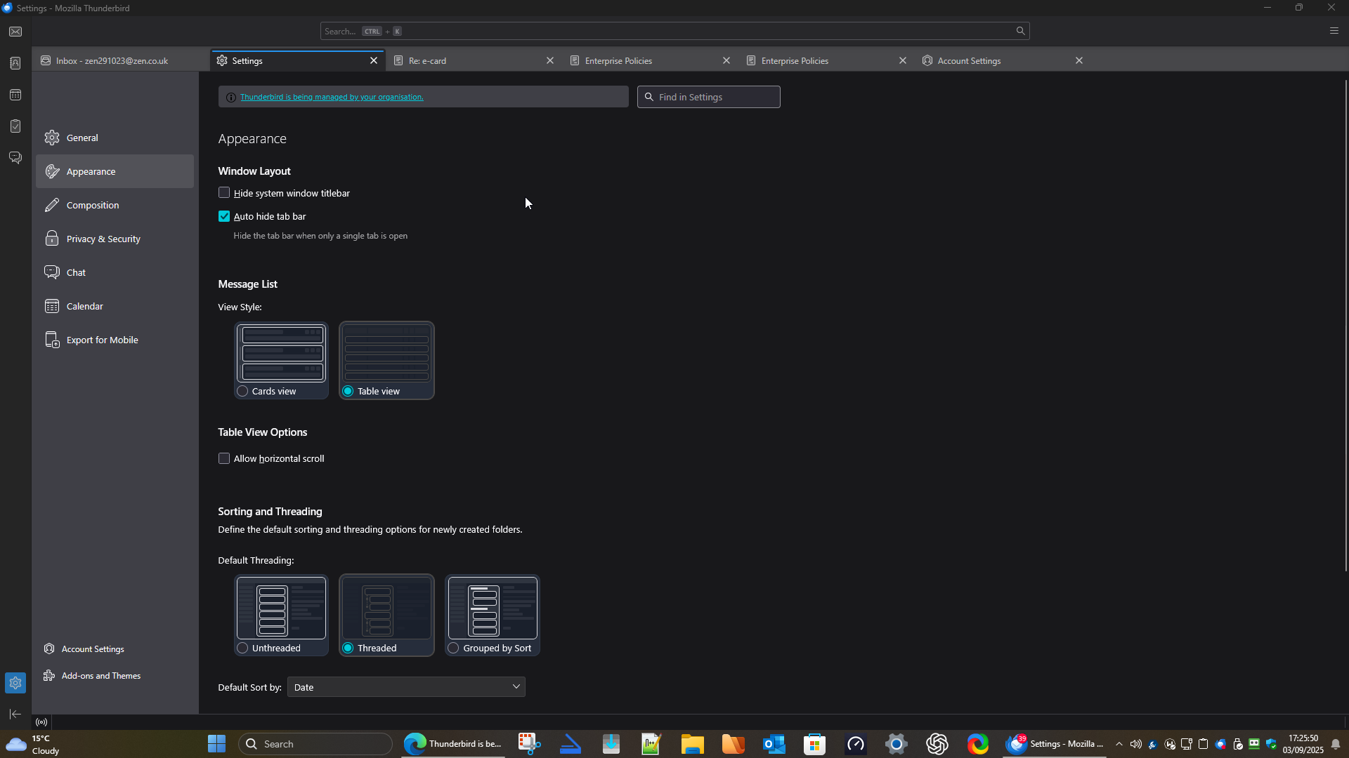 Did you click on that Thunderbird is being managed by your organisation' link text to see what information it offered ? What info does it offer ? Maybe you have Windows Security Anti-Virus or another AV you installed which is allowed to scan files or scan downloaded emails ? If you disable AV from access to Thunderbird profile - maybe set up an exception to block scanningetc then restart Thunderbird do you still see that message? Or you could restart computer in 'safe mode with networking' (you would need to connect to router using an ethernet cable to do this) - or start in 'Safe Mode' but internet may not be available - does not matter - does that message disappear from Settings window ?