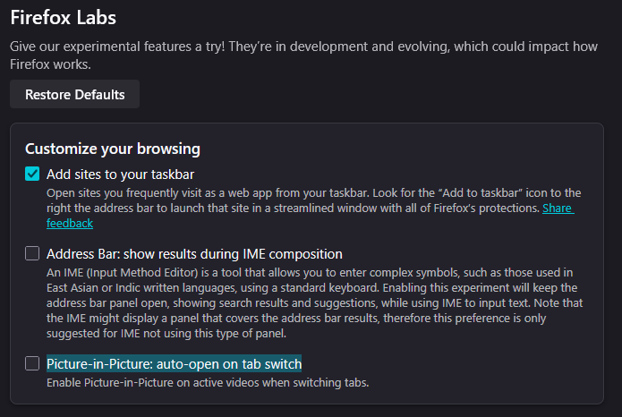 The settings regarding picture-in-picture mode (in general) and the Firefox Labs' "Picture-in-Picture: auto-open on tab switch" do not seem to work. I am disabled and re-enabled these settings multiple times, though picture-in-picture mode still auto-opens on tab switch. I have restarted my computer and Firefox multiple times.
