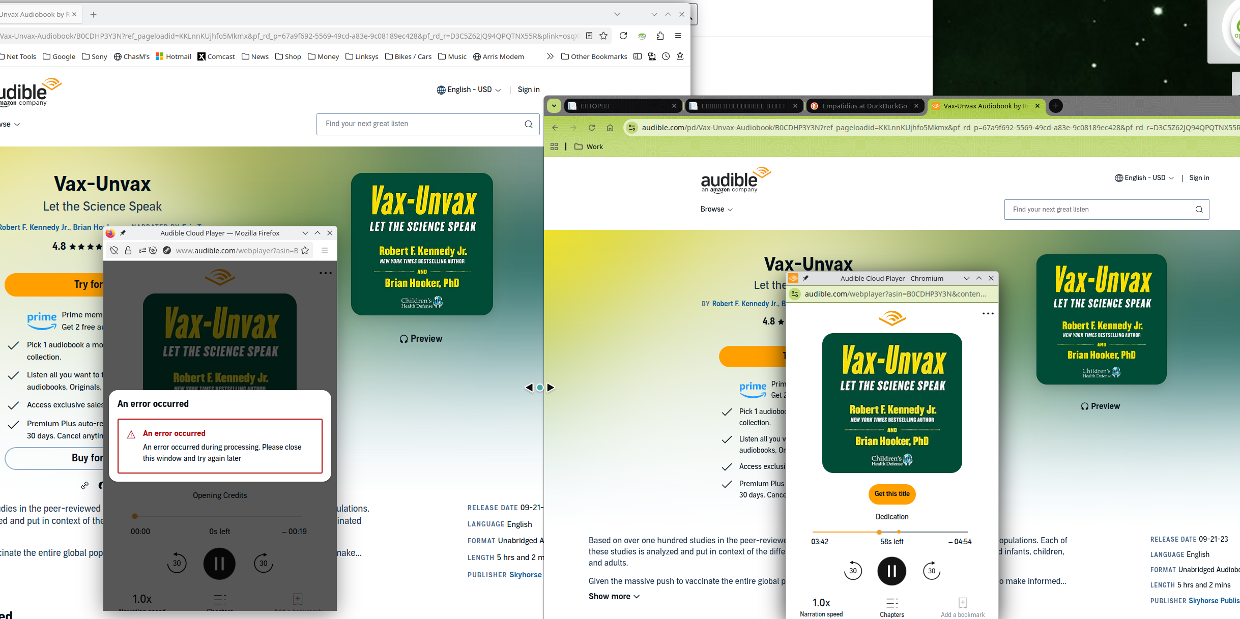 Yes, I'm just playing samples and they start, but the audio is choppy and then after 2mins, it stops playing. https://www.audible.com/pd/Vax-Unvax-Audiobook/B0CDHP3Y3N?ref_pageloadid=KKLnnKUjhfo5Mkmx&pf_rd_p=67a9f692-5569-49cd-a83e-9c08189ec428&pf_rd_r=D3C5Z62JQ94QPQTNX55R&plink=osqXVCrixiJX5hGh&pageLoadId=kbPcaJWAKBARxS0a&creativeId=f95414bc-7ba6-4405-a00d-814a498f7165&ref=a_pd_The-Fi_c5_adblp13npsbx_4