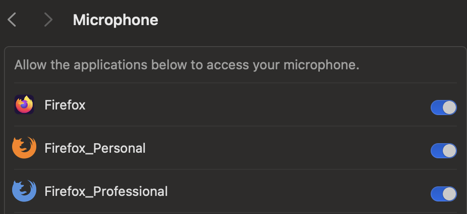 The issue is that once the applet is used and firefox has been opened, there are issues with permissions. In settings, it is clear that both microphone and speaker permissions have been shared with the applets AND firefox itself (see image 4).