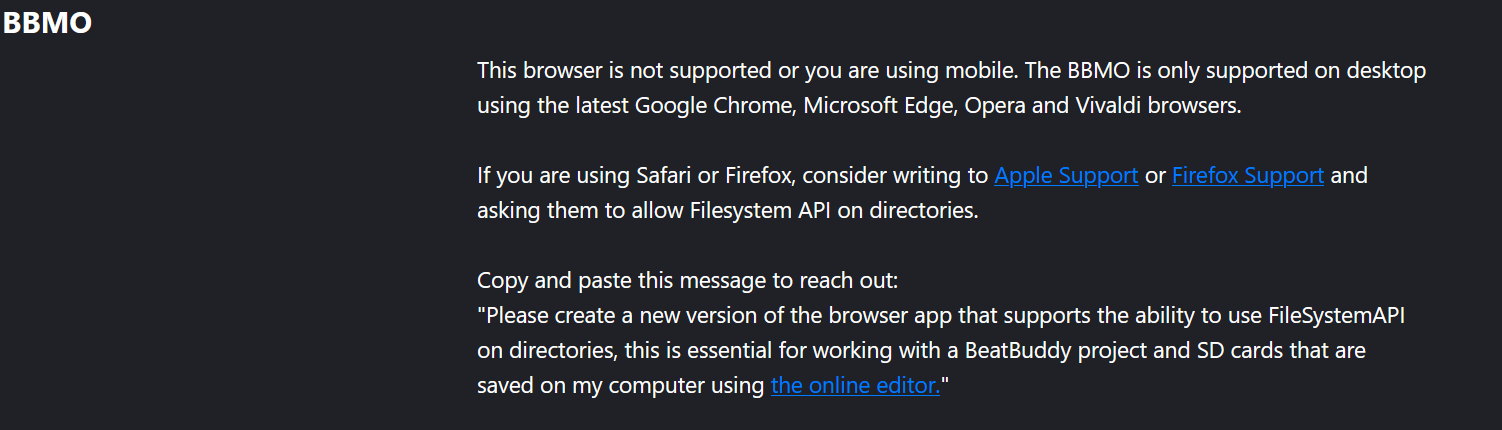 Hello, "Please create a new version of the browser app that supports the ability to use FileSystemAPI on directories, this is essential for working with a BeatBuddy project and SD cards that are saved on my computer using the online editor." Thanks Kind regards Claude