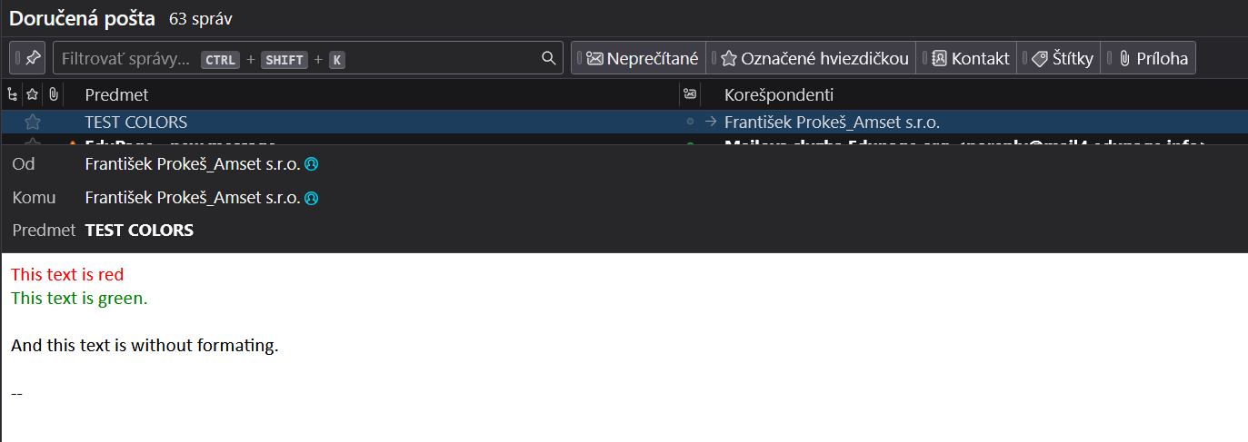 All received emails have white text in the body. But in the original message is some text green and some red. I can see those different colors only if I try to forward the message or switch from dark to normal.