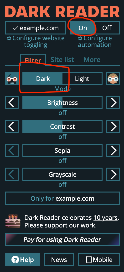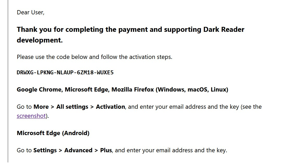 I PAID for "dark reader" I got the activation key but I cannot activate it because the instructions says go to "MORE" and there is NO "MORE"! I hunted all over the settings & extension & themes, but I cannot find anyplace to activate this extension. Did I just waste my money? I have poor vision, I NEED a dark page with white letters. Thanks to being a touch typist, I don't need to see the keybord or page to type but i can't see what I am typing on a dam w hite page! I now cannot click on "Email me when someone answers the threadil"