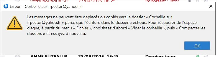hi, Icannot copy, delete, move, send, receive messages On TB I have 4 different accounts. 2 work perfectly, 2 have this problem. I can't not possible delete, copy, move, send or recieve messages, I have 4 comptes, 2 run perfectly, 2 have this problems. TB is instaled on a old PC (10 years) W 10 Intel core i5, changed the DD to a SDD 500 GO and RAM 12 Mo. now I have installed TB and restored the directory "Profiles" on another PC, only 2 years old and TB run very well Thank you for your help Please excuse me for my english.