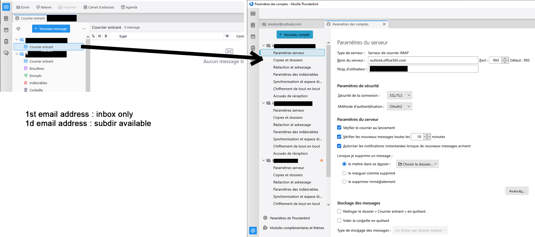 I added several accounts (email address) using the same procedure. But yesterday I create a new account in Outlook that works fine but that is uncomplete in Thunderbird. It is the first one in the attachment. As you see IMAP was selected by default and should work...