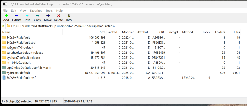 I created a new (very small) backup file using MozBackup. I watched where the file went and it was the same format as the one I had from April 2025. I did a restore using the April 2025 one and everything came back. YEH!!!