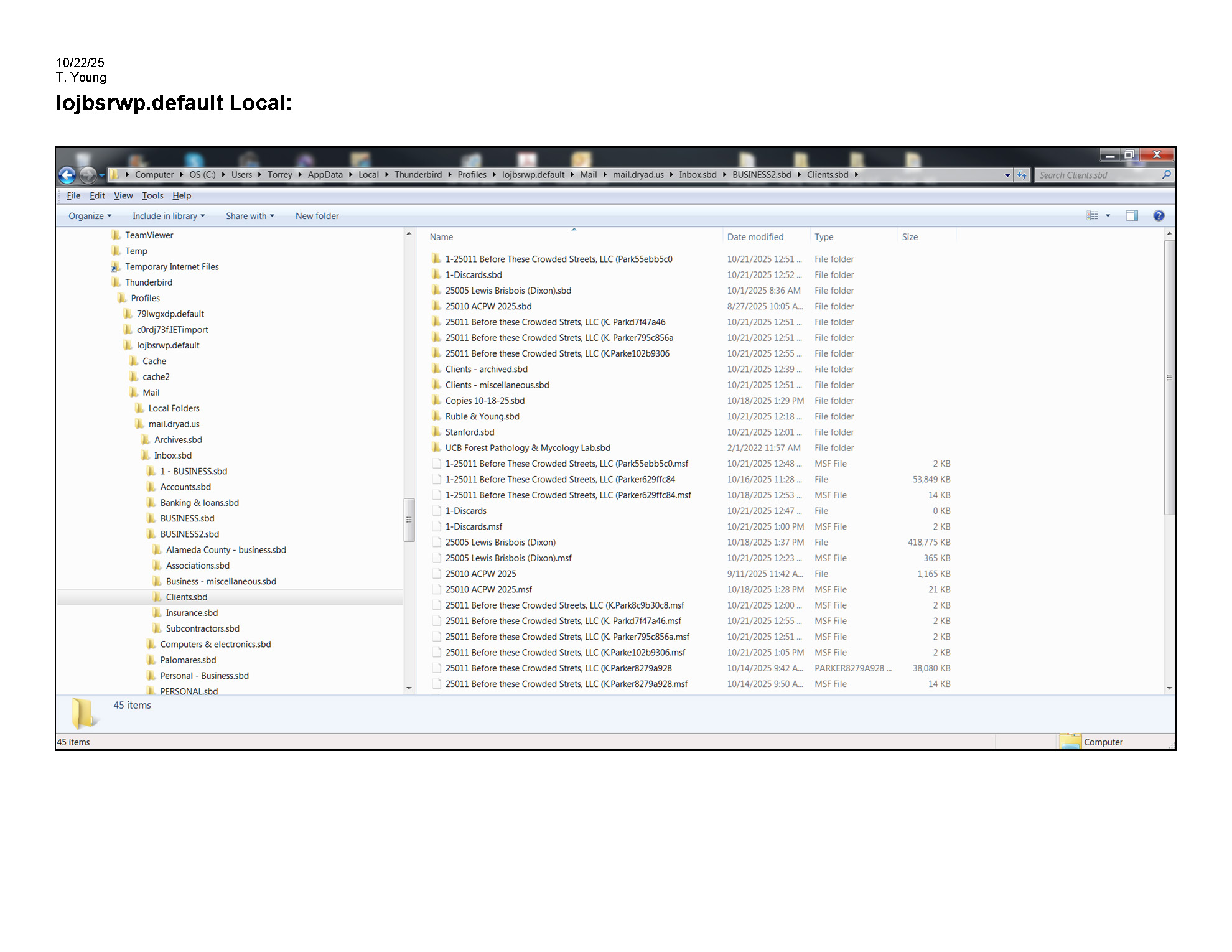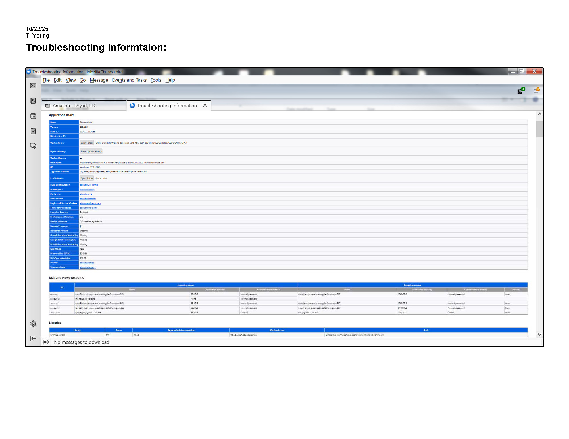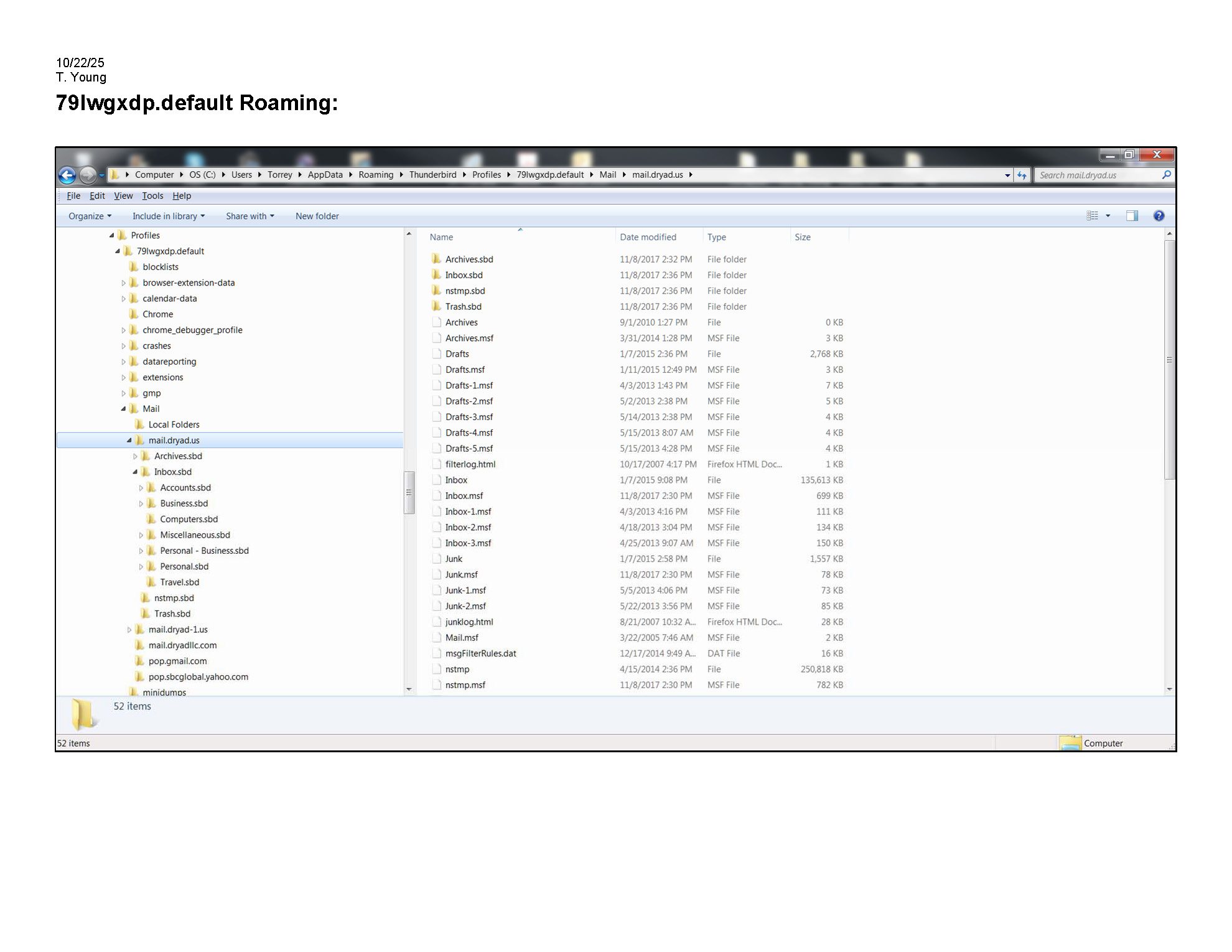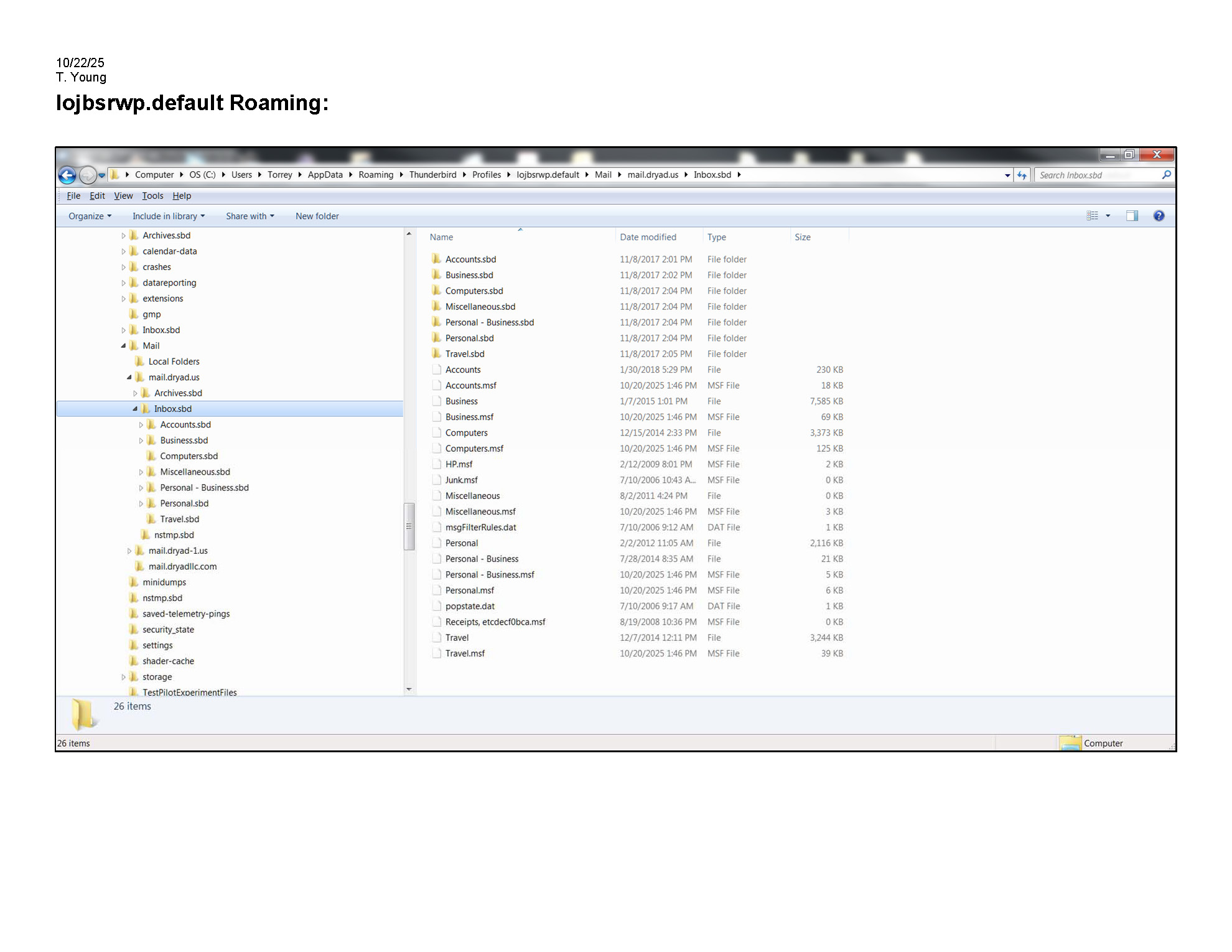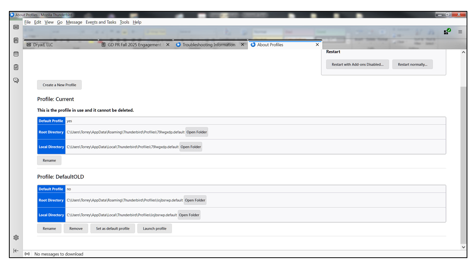 - Stopped renaming. No problems with adding new folders, however. Dryad.us is the only account where I have experienced the folder issues... other than location. - Three POP3 emails: dryad.us, dryadllc.com, gmail.com. Dryad.us is my primary. - One IMAP email: info@dryad.us. Shows as an IMAP account but I have no idea why. - Thunderbird About Profiles cites 79lwgxdp.default as the current default, but none of my current folders show under that profile in any location. - Thunderbird About Profiles cites lojbsrwp.default as "lojbsrwp.defaultOLD". lojbsrwp.default is the only profile that shows current folders. However, if I start Thunderbird in that