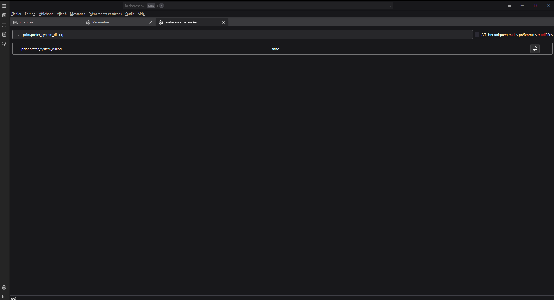 Configuration editor for Thunderbird https://support.mozilla.org/en-US/kb/config-editor Enter a search term print.prefer_system_dialog You can double-click on the preference to set the value to true