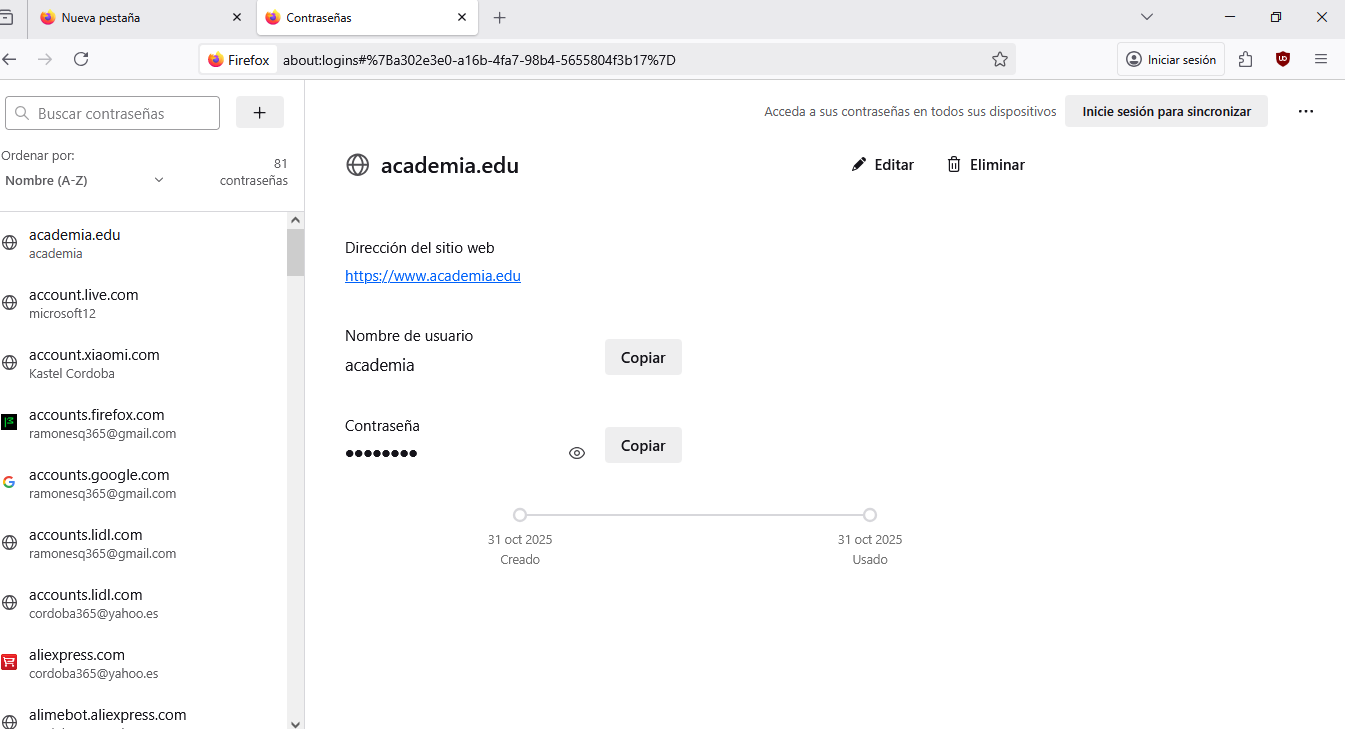 Como puedes ver, están las contraseñas importadas de un fichero CSV, están presentes Cierro FireFox y abro de nuevo y ya han desaparecido Captura de pantalla contraseñas.png y contraseñas2.png Lo he dicho un millón de veces, esto ocurre después de una actualización, antes si guardaba contraseñas. ¿Nadie del foro sabe de este problema? Saludos