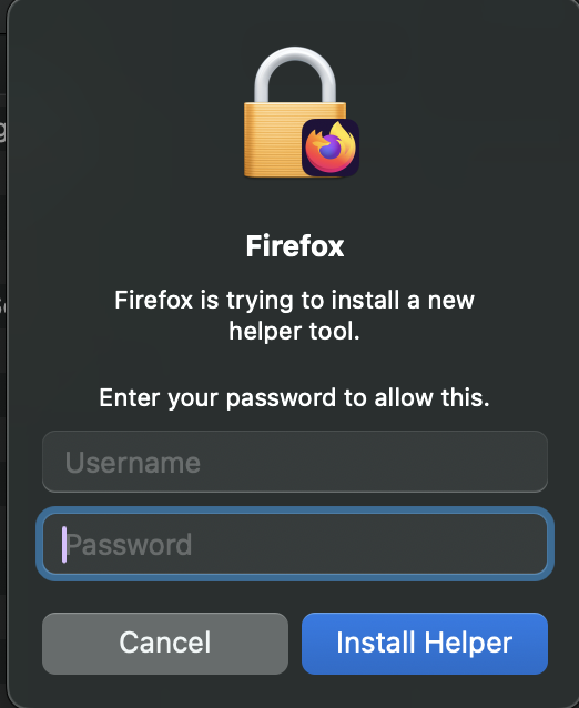 Firefox won't launch, says it's trying to install a new helper tool (MacOS)