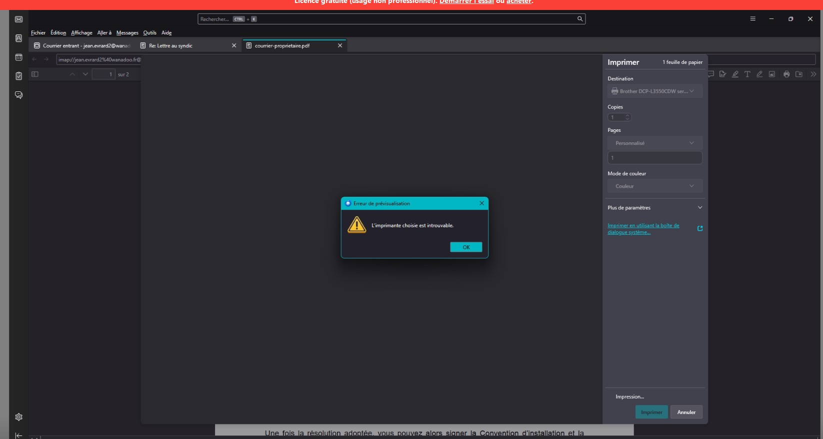 Bonjour, J'ai un problème pour imprimer depuis Thunderbird. Lorsque je tente d'imprimer, mon imprimante Brother s'affiche momentanément, puis un message d'erreur apparaît indiquant "L'imprimante choisie est introuvable". J'ai supprimé mon profil de Thunderbird pour paramétrer à nouveau le logiciel avec mon compte de messagerie et j'ai réinstallé proprement mon imprimante Brother. Je précise que je peux imprimer en dehors de Thunderbird. Est-ce que vous auriez une solution à me proposer ? Ci-joint, une capture d'écran du message d'erreur. Cordialement. Cyril.