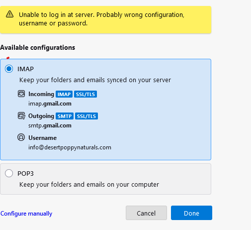 Getting errors setting up gmail accounts "Unable to log in to server"