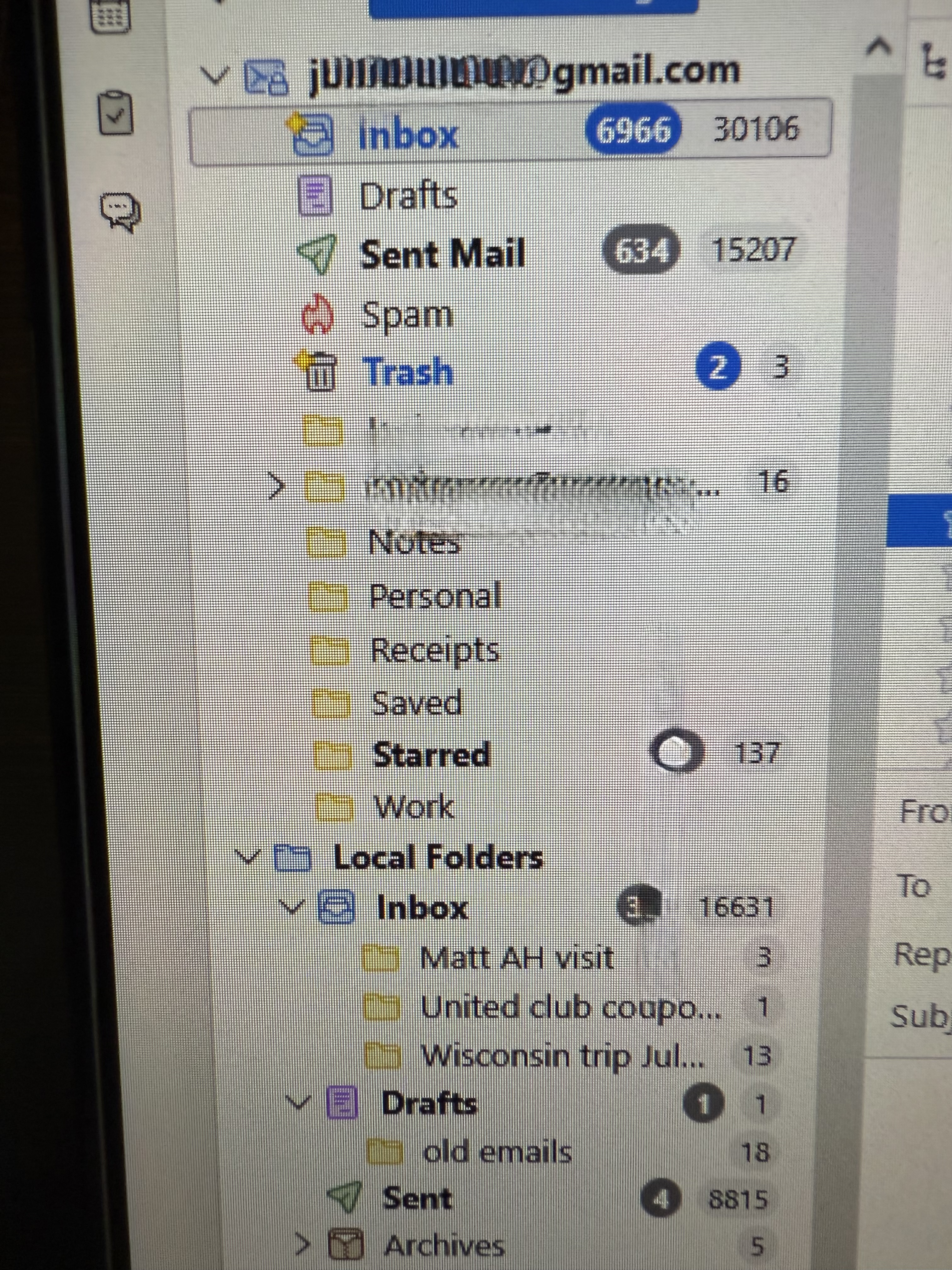 I got a bad bug a while ago and turned off all settings I could find in TB so as not to pass anything more to friends (which already happened somewhat). After clearing desktop well I went to turn on settings in TB again, not really knowing what I was doing. All of a sudden I had the top part showing with the gmail, inbox, trash, spam, down to Local. Like I said, I always showed about 16000 emails in TB for long time before the changes.