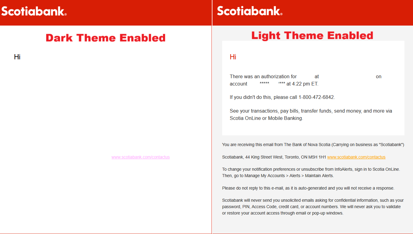 Why are some emails unreadable when the dark theme is enabled, but completely legible when the light theme is enabled? 1st picture is the email with the dark theme enabled, 2nd picture is the same email with the light theme enabled.