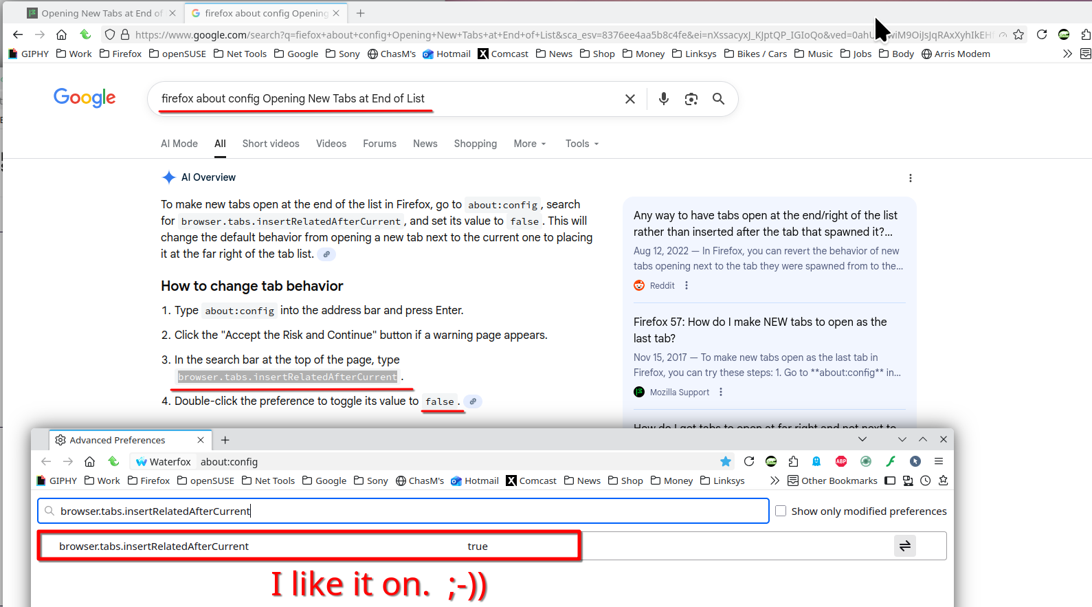 I have recently switched computers, and since it has been a while, I can't remember the setting on the 'about:config' page that I need to change to where when I open a new browser tab, it opens at the end of my list of tabs, rather than as the next tab. Thanks!