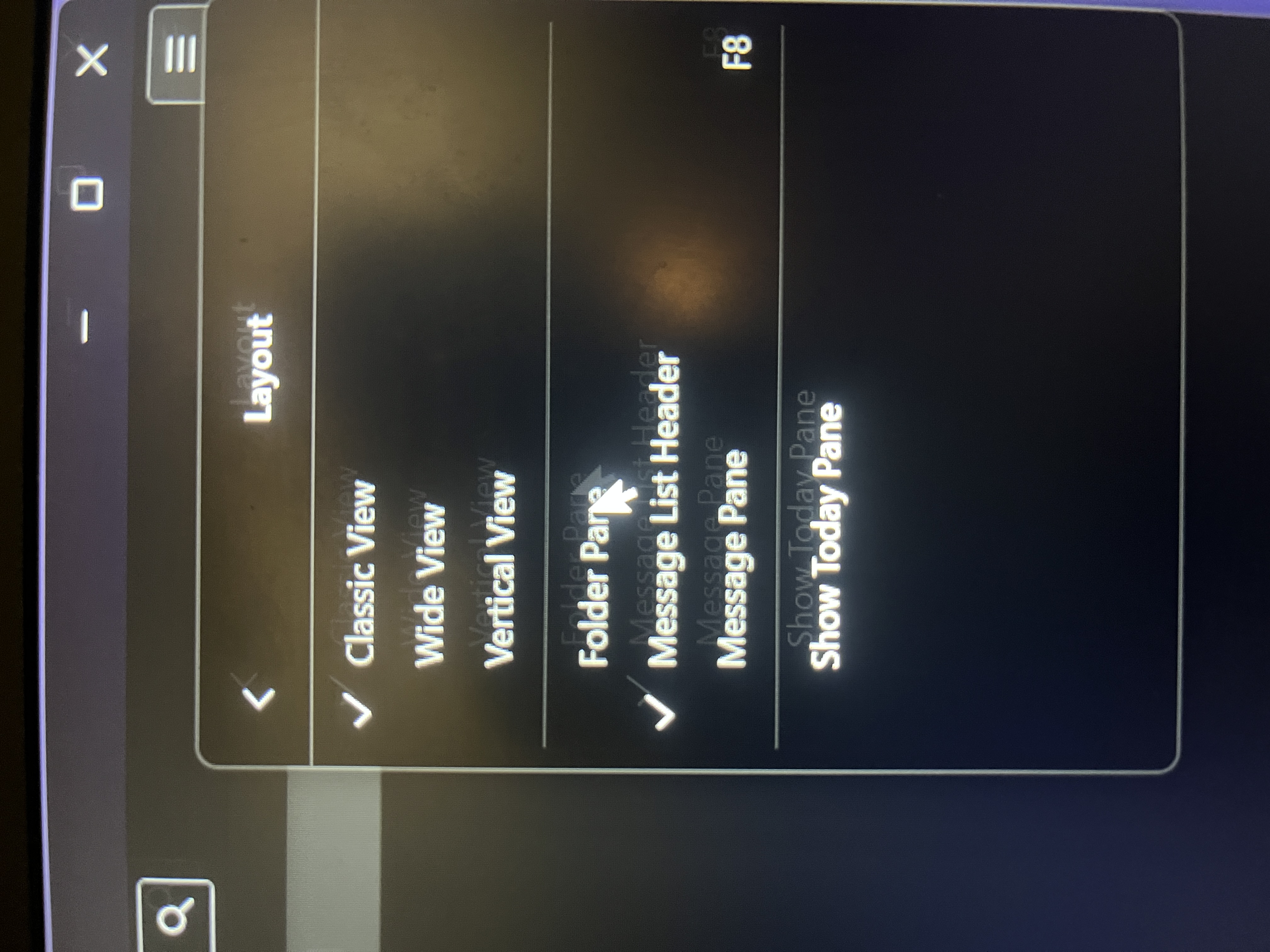 I get a message that the Progran is not responding. After waiting for a couple of minutes, I could click on layout, but folder pane is grayed out and I can’t click it. Message list header is checked off, but that is grayed out also!! I can only click on Show Today Pane