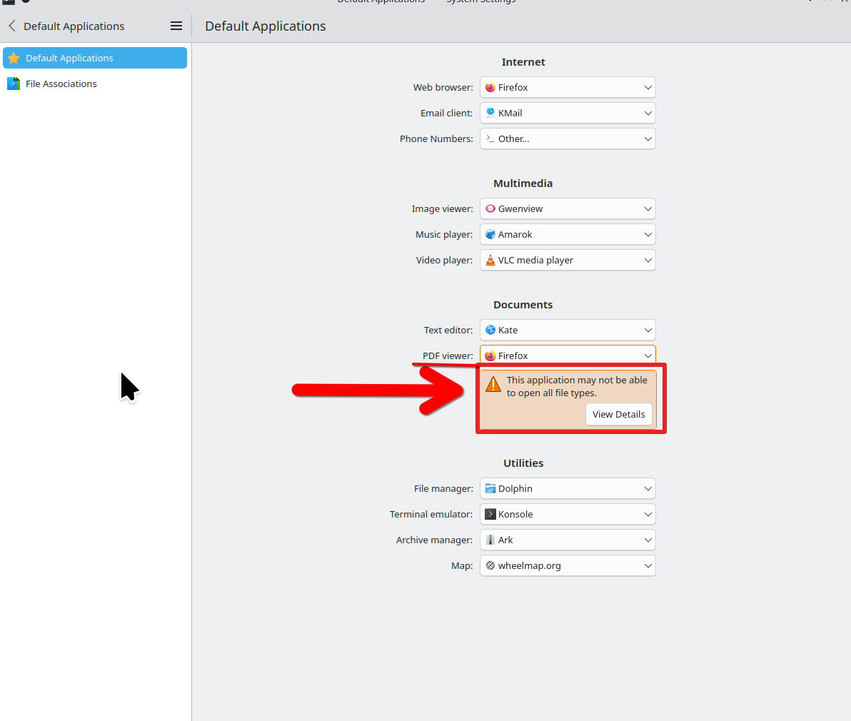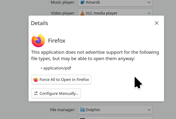 Interesting... Show where you set Firefox as default and since I'm also on KDE try to replicate. I get the attached warning when setting Firefox as default. The warning does make sense.