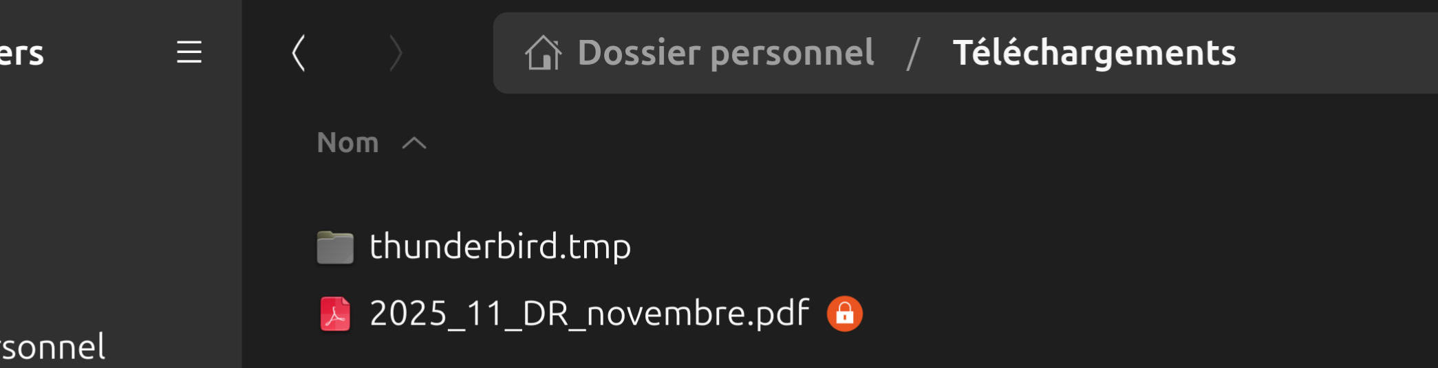 Hello! See the screenshot please: so, I downloaded à pay-bill, with Firefox (under ubuntu), in private navigation, and I get the file with a padlock-symbol at the end. What means that? What means that for me (on my computer), what means that for à friend, when I sent him the pdt-file (can he open it?). Nota: I understood that I can choose between "delete downloads when closing the privat window" or not. And I choosed not to delete them (but there appears this padlock-symbol). Thanks for your help! Michael from France