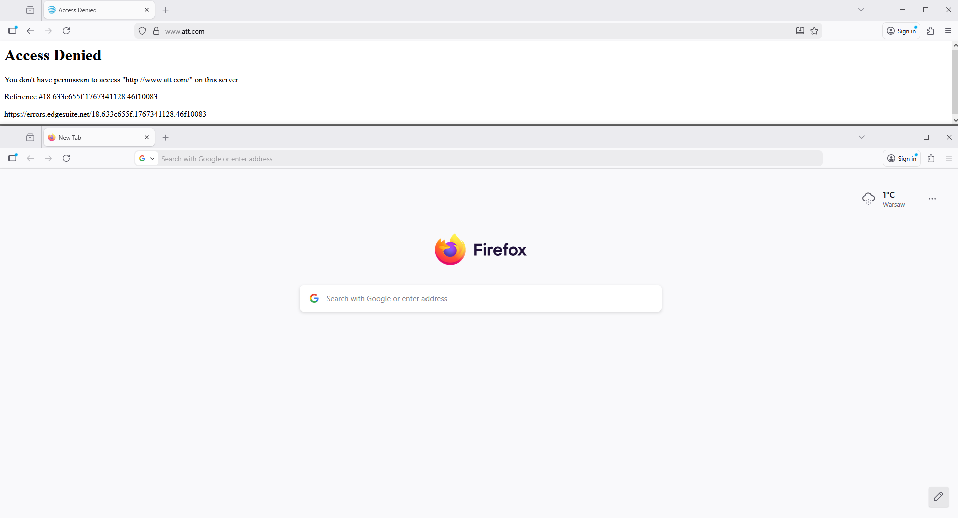 when I go to a web site I get an error msg saying You don't have permission to access "http://www.att.com/" on this server. why and what does it mean and how do i fix it?