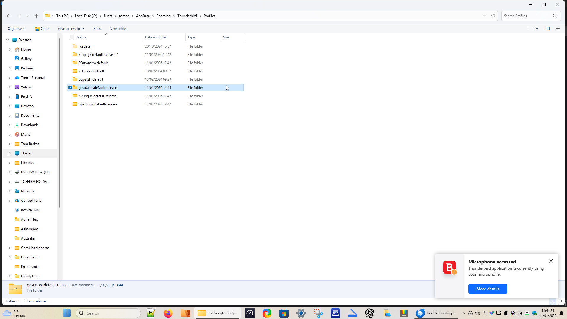 Hi David, I checked the profiles again. Two were from about a month ago, 1 was my real profile and the others were dated today, but 20 min instead of 1 min for the real one. I checked the two accounts and the local folder and all pointed to the real profile. I copied all 6 of the other profiles to another folder, then deleted them from Profiles, So far, TB appears quite happy.