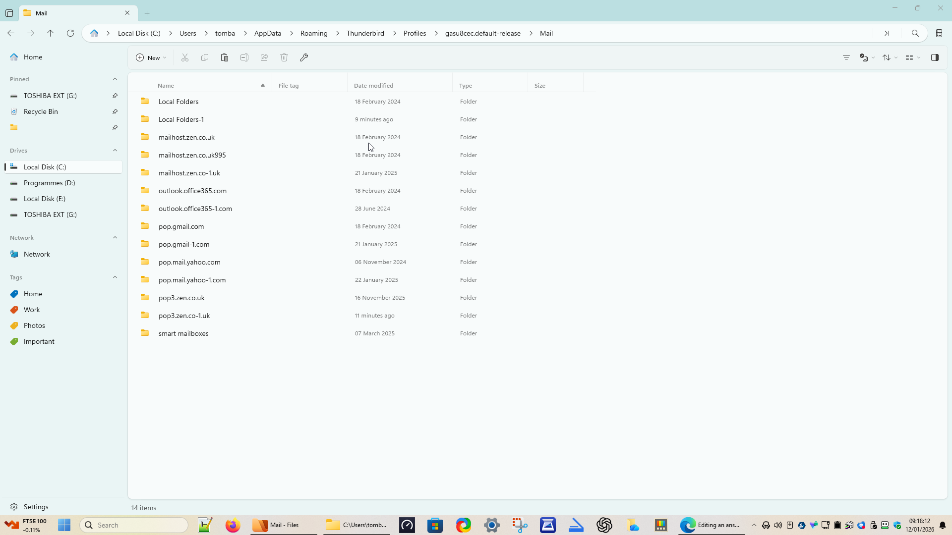 I've been to about profiles and have realized that most (the small ones) do not have a Mail folder, but one has a 3.5 Gb mail folder. This is a hangover from the number of times I've had to reinstall Thunderbird - it contains all my emails from 2019-2023, while the default one has emails from 2023- now. I don't suppose there is any way of merging them?