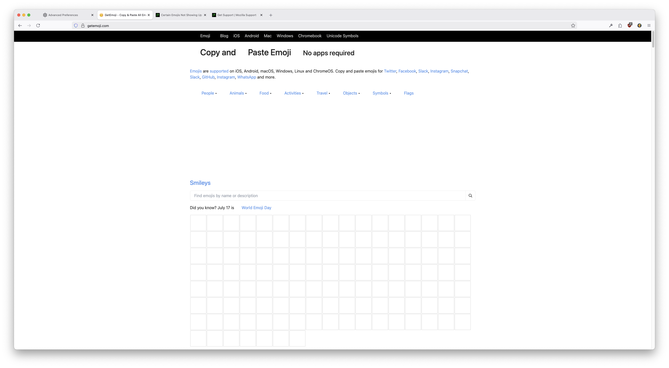 Web pages that are supposed to contain emojis are blank. I can highlight where emojis are supposed to be shown but the actual images of the emojis aren't there. about:config font.name-list.emoji correctly contains "Apple Color Emoji" If it is relevant, this has been a bug/issue that has persisted for a couple of months now (can't name an exact date).