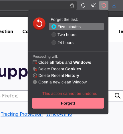 I'm using this button, but I should like the button to work in a different way. What I want is that everything except from browser history is deleted, when I click the forget icon. It should not be necessary to first click the forget icon, and then "Forget!" (as in the attached image). I don't neither want to restart the browser or open a new clean window