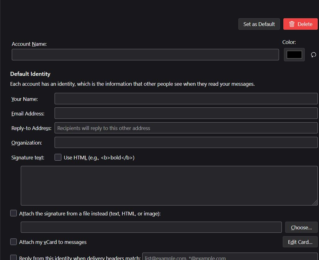 Also, if I change the color, or the account name, or try to delete the account, nothing changes, even before restarting Thunderbird. That's why I think none of the changes on the Account Settings page I screenshot are saved, but the ones in subpages (like Server Settings and Spam Settings) seem to be working, though I haven't tried altering them for fear of breaking them.