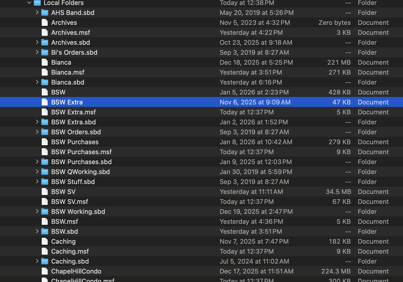 You wrote that the .sbd and the .msf files are still present. They do not appear in your image. Are you saying that BSW had sub-folders and those sub-folders are gone now? What happened to the .sbd file?