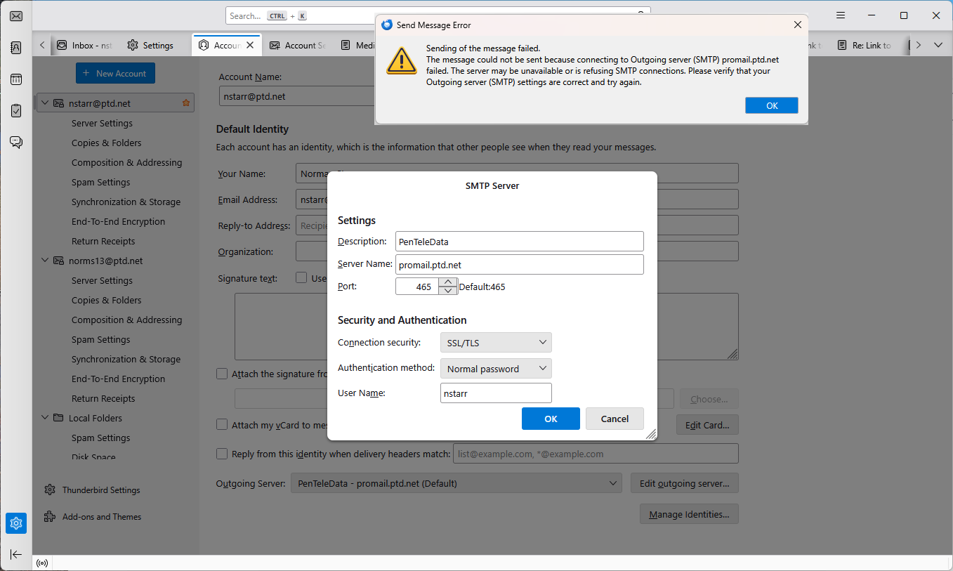 The attached shows the error message and my SMTP settings (1st image) and my service provider's email server settings. I tried changing the SMTP port to 587, but this resulted in a time out error.