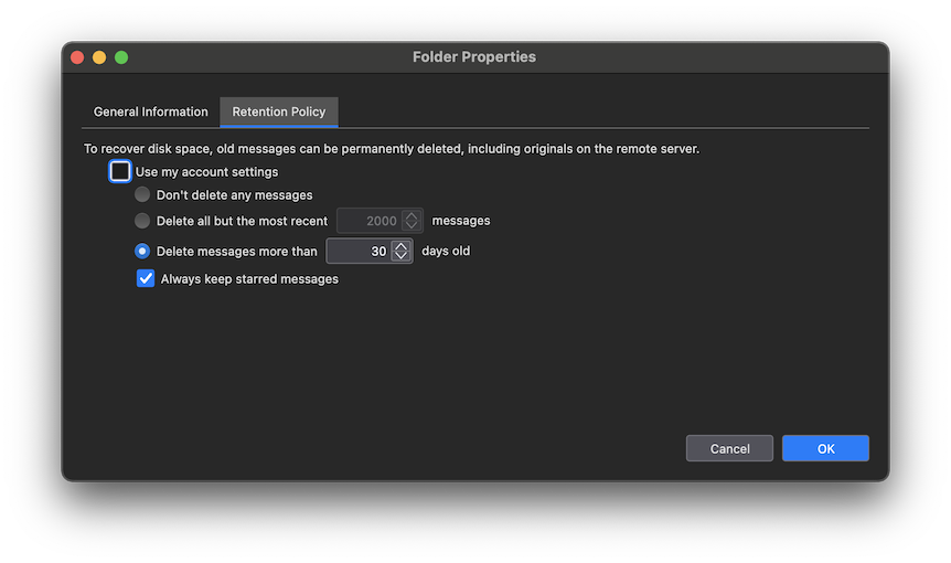 R-click on your Trash folder > Properties ... In the "Folder Properties" window click on the Retention Policy tab, uncheck "Use my account settings", activate the radio button "Delete messages more than xx days old" and click OK. This setting is only valid for this individual trash folder, it must also be modified for other accounts trash folders if you wish it.