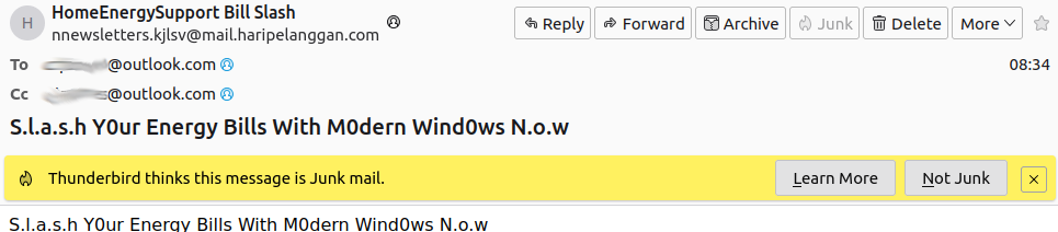 This mail has a yellow banner at the top stating "Thunderbird thinks this message is Junk mail".