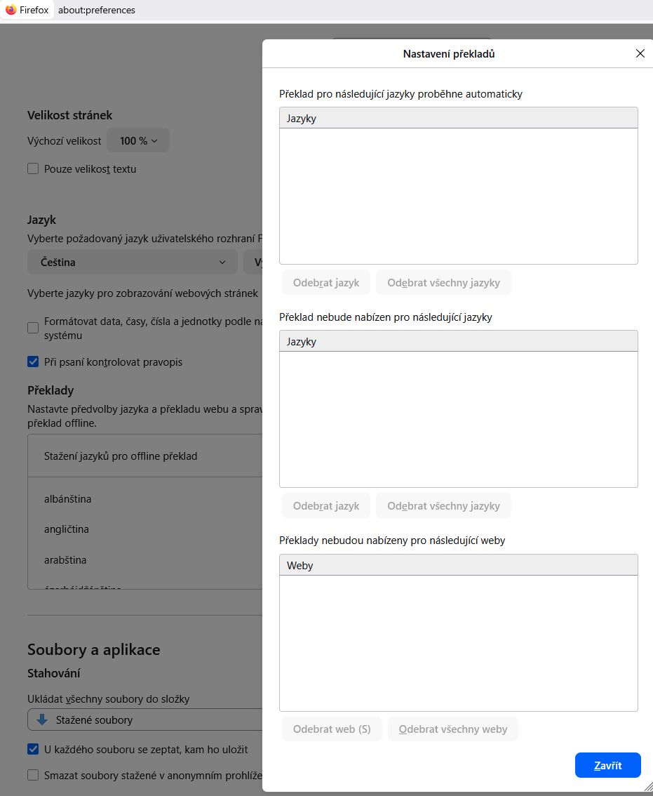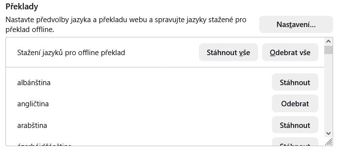 Firefox umí překládat jen mezi omezeným počtem jazyků (typicky EN, DE, FR, ES, IT, PT, PL aj.). Čeština mezi podporovanými jazyky není – ani jako zdrojový, ani jako cílový jazyk překladu webu. Proto se u českého Firefoxu vůbec nezobrazí nabídka překladu, nebo se neobjeví žádný jazyk v „Překlad webu“, i když jsou stažené offline balíčky.