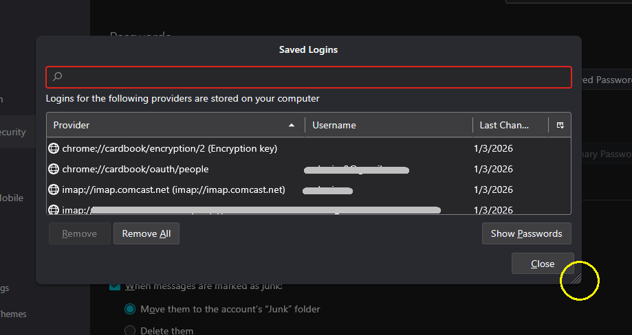 when I view the saved passwords, the saved logins window does not work properly. I cannot drag the borders left or right to view whole information such as passwords or provider. The borders just refuse to move. I therefore can only view partial information under any heading. Please help if possible. Thank you.