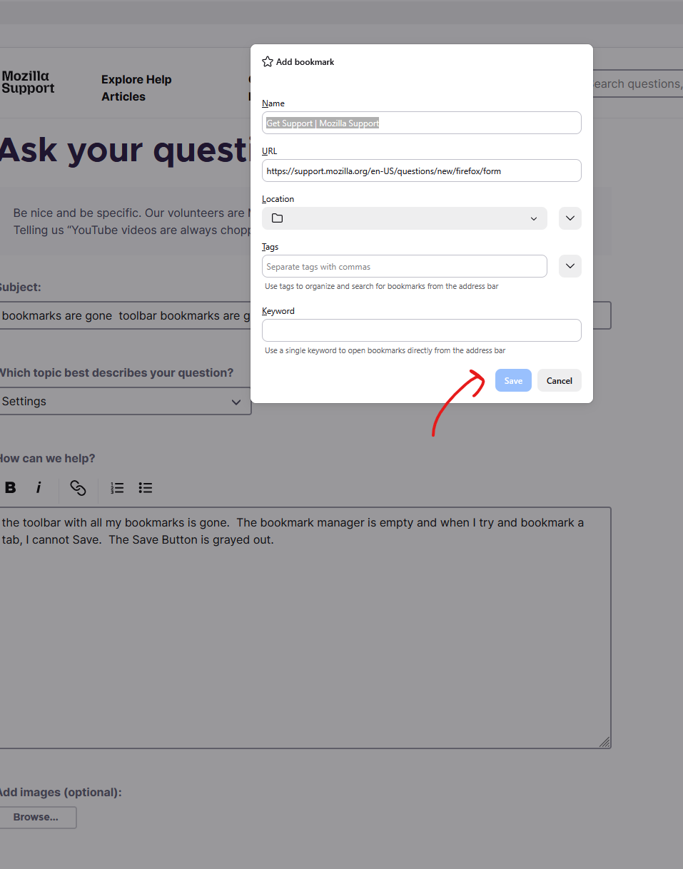 the toolbar with all my bookmarks is gone. The bookmark manager is empty and when I try and bookmark a tab, I cannot Save. The Save Button is grayed out.