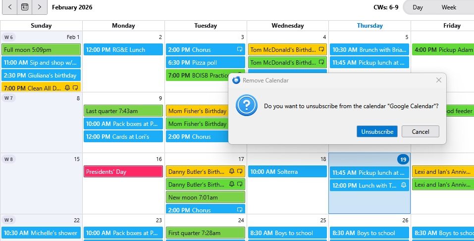 I have several different local calendars set up in my Thunderbird. I want to unsubscribe to a specific one. When I select "Unsubscribe from Selected Calendar" from the Events and Tasks drop down, the Calendar selected is not the one I want to subscribe from. How do I select the Calendar I want to unsubscribe from prior to selecting that menu option. I have searched through the forums and have found references to opening a Calendar tab and right clicking on the left pane to select a Calendar. When I right click on the Calendar tab, I just get the options to Open in New tab or close the current tab. I'm not understanding something and I'd appreciate any clarification on this step. I am including a screen shot that shows the Unsubscribe screen. The calendar that is selected is my Google calendar, but I don't want to unsubscribe from Google. I want to unsubscribe from a duplicate local calendar. How do I do that?