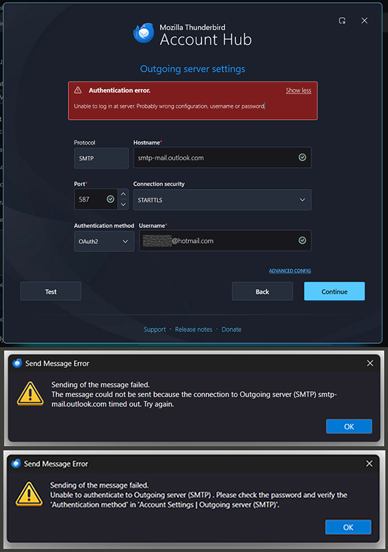 I have been using Thunderbird with two POP3 Hotmail accounts for some time and I am trying to set up a third account with exactly the same configuration. However, both the automatic and the manual configurations failed. The new account receives mail, but the outgoing smtp server config seems to have a problem. Sending messages times out or keeps prompting for a new password.
