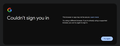 Google will not allow me to sign in when using firefox, no matter what i do the message is always the same: Couldn’t sign you in. I tried literally everything that is mentioned in the guide: refreshing firefox, resetting cookies, disabling all extensions, disabling my anti virus. I even uninstalled firefox and deleted all user data, to ensure that firefox was as good as new, and it did nothing.