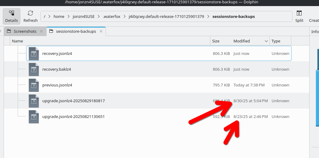 Hey Mike, Can you post a screenshot(in detailed view to show date and size) of the files in your sessionstore-backups folder. see old screenshot of mine What date was the issue?