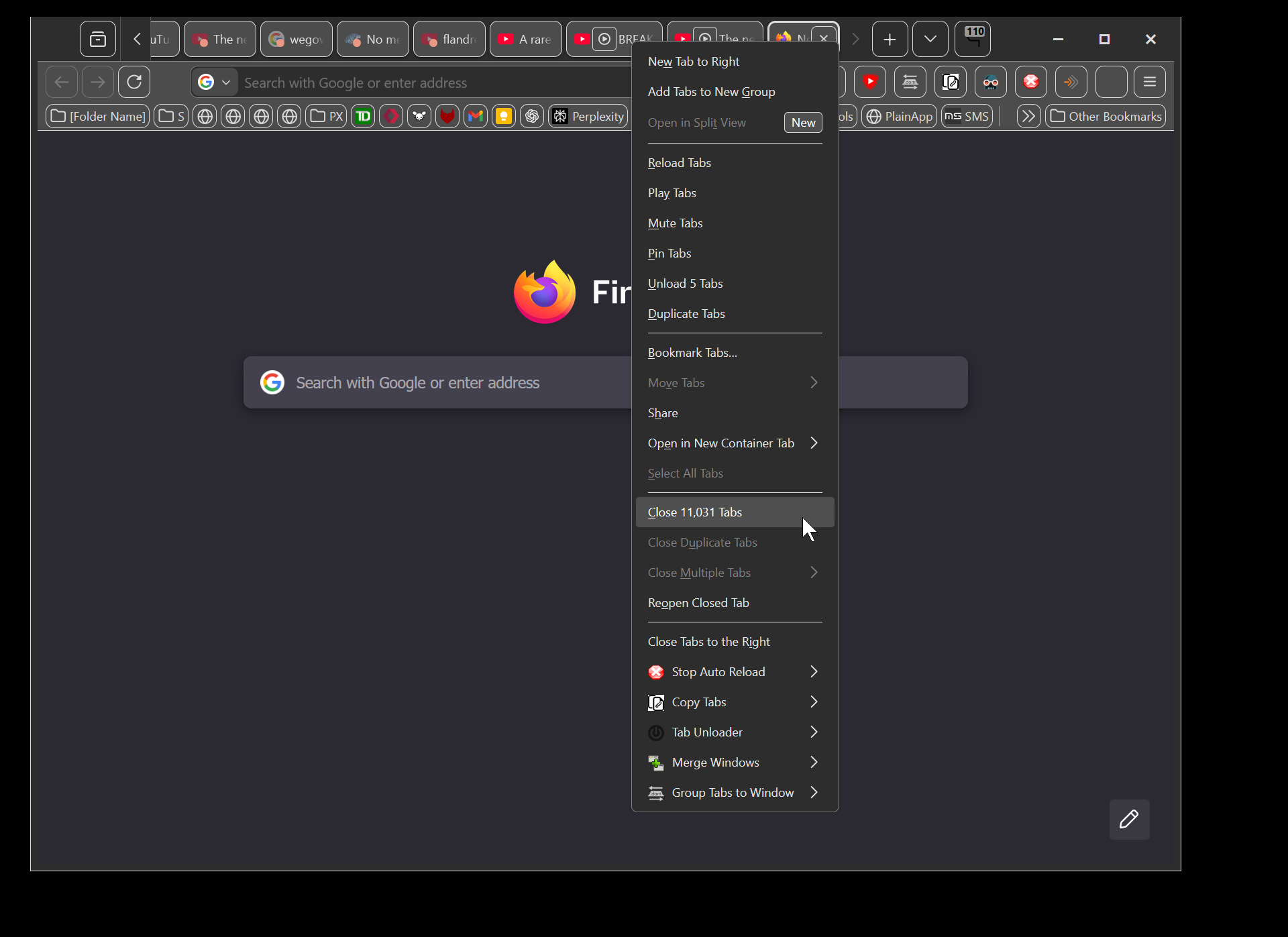 Also, bookmarking all the tabs, took 4 seconds, while selecting all tabs too minutes. I think the "select all" function could do well to have some optimization as it starts getting slow with as few as 1000 tabs. And