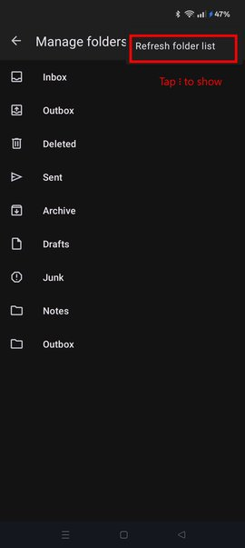 Within the Android app there is no setting for manage folders nor an option to refresh folders!