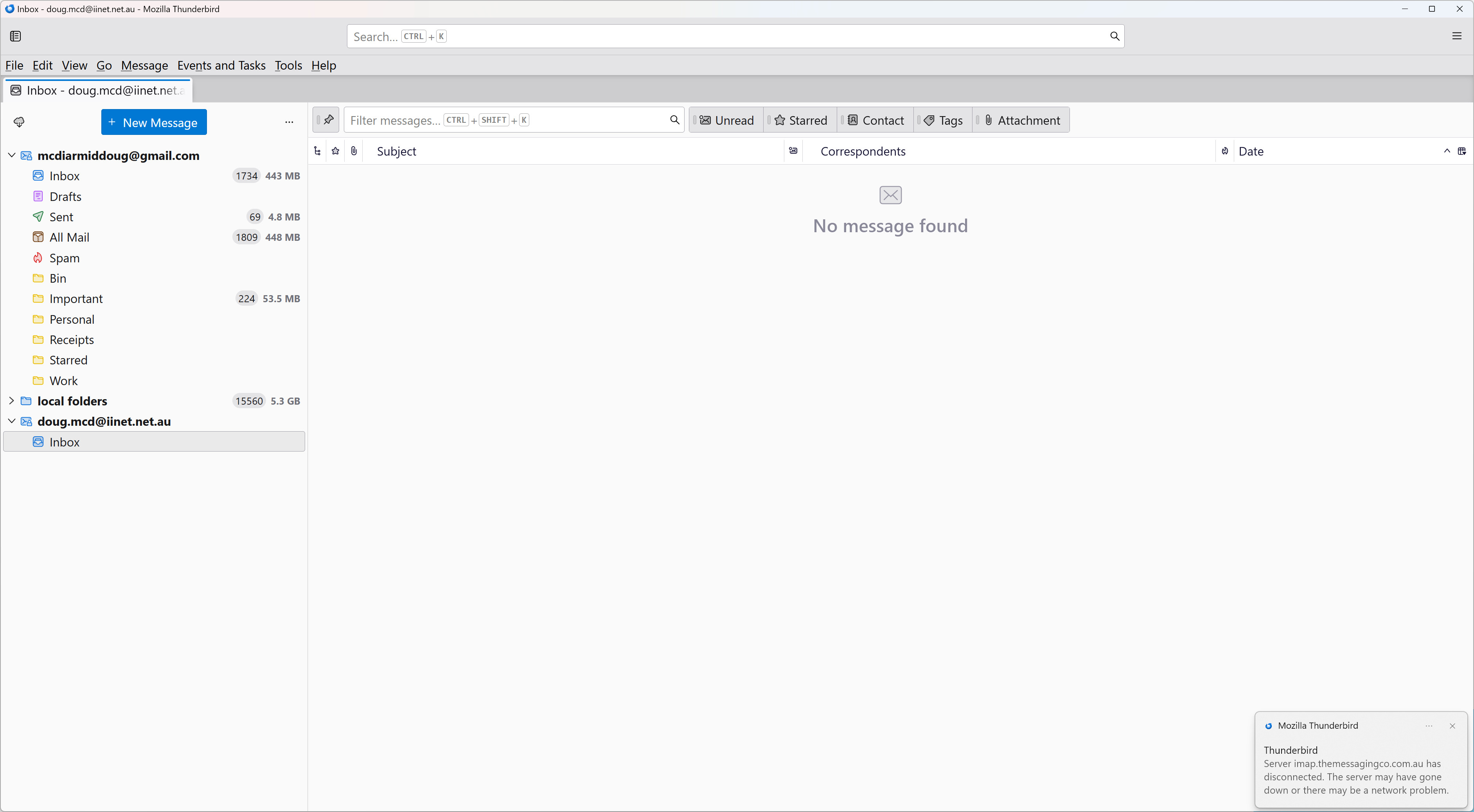 Cannot access Tbird on PC, but have done so using Outlook; and Tbird Outlook & Samsung mail on mobile. Gmail: some new messages and those quite old are accessible. See Screenshot. iinet: nothing accessible. See Screenshot. The password used to access on webmail works there but is not working in Tbird on thePC. Three technicians have attempted and myself have attempted to rectify. A primary password was used earlier, this has been unsuccessfully tried. It isn't required now. I fear this may be the problem but don't know how to rectify.