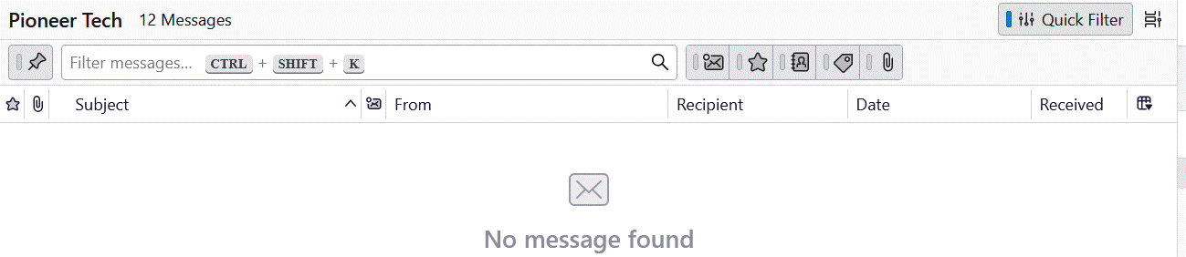 I've tried Troubleshoot mode, everything I can seed for filtering options. I still see the folder has 12 messages in it but the window always shows No messages found.