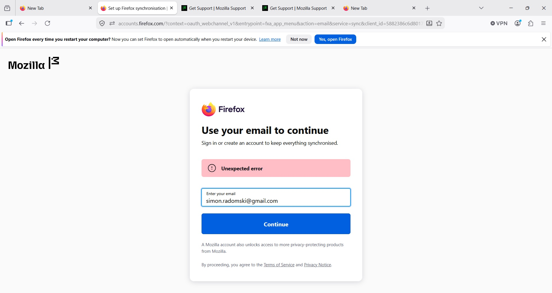 When I try to sign in from Firefox I get the message "Unexpected error". I can sign into my account online but only using Google to sign in. If I try to sign in to Mozilla directly, I get the same message.