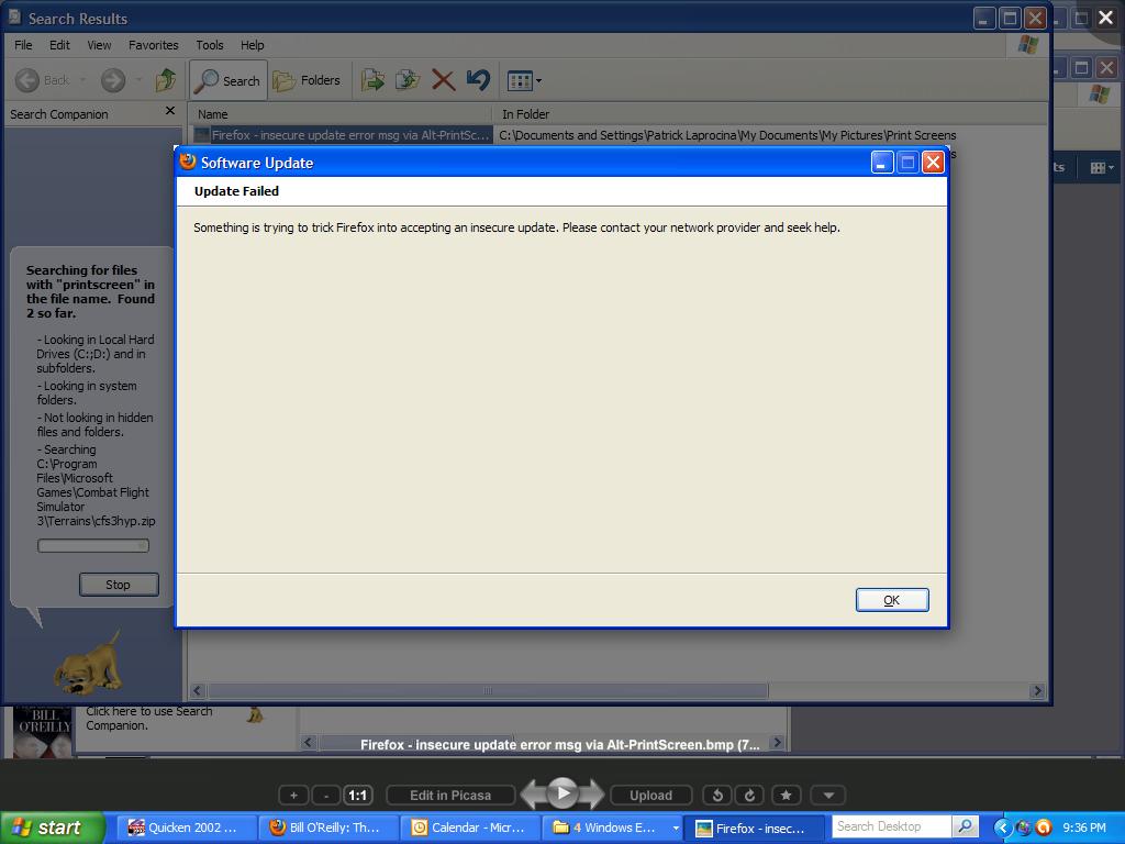 At random times, I get a pop-up from Firefox 4.0 that is bannered, "Firefox Update", the sub-banner is "Update Failed", and the data is, "Something is trying to trick Firefox into accepting an insecure update. Please contact your network provider and seek help."