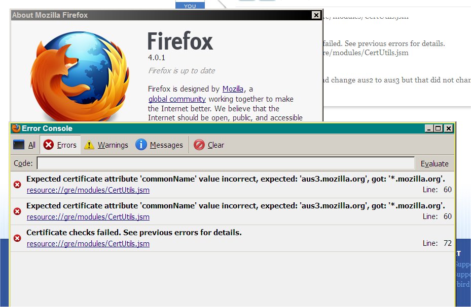 Error: Expected certificate attribute 'commonName' value incorrect, expected: 'aus3.mozilla.org', got: '*.mozilla.org'. Source File: resource://gre/modules/CertUtils.jsm Line: 60