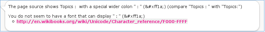 The page source shows Topics: with a special wider colon ":" (:) (compare "Topics:" with "Topics:")