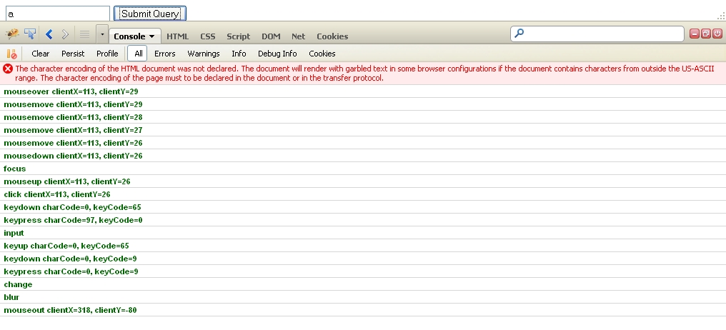 - Type in a letter in input box and use mouse to click on button (note change event fired)