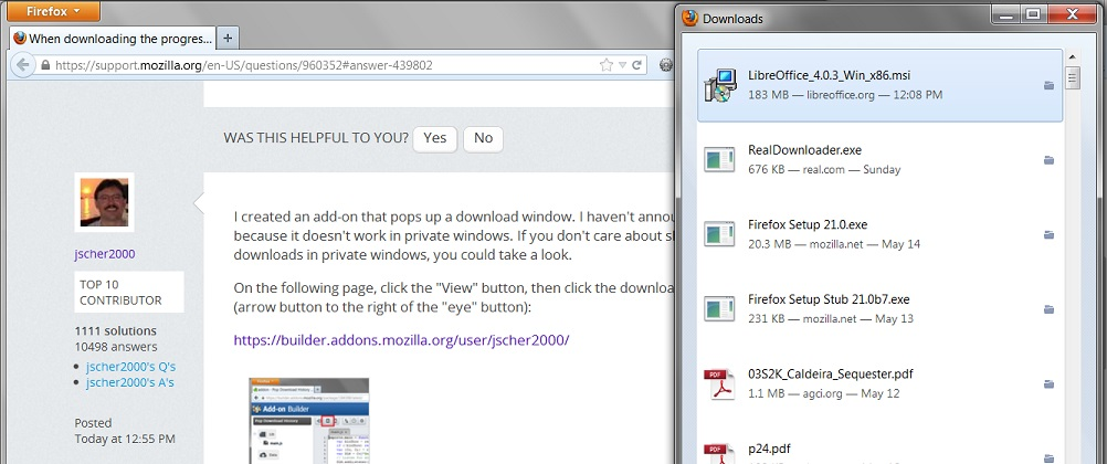 Thank you all I am in Mozilla Firefox While not computer illiterate, some of the replies will take some thinking out for myself. The thing that I was getting at was that in the last few months Mozilla has had updates and pre 2013 when I started a download (audio as in software which can be over two hours worth or more to download) a good sized download progress box would come up to indicate time to download end. Easy to see from a distance initially and when when you are working at something else. For the vision impaired or the elder person without 20/20 vision the arrow which turns into a very small box with a very small green line as a bar graph on the upper right of the screen, is most difficult to see.