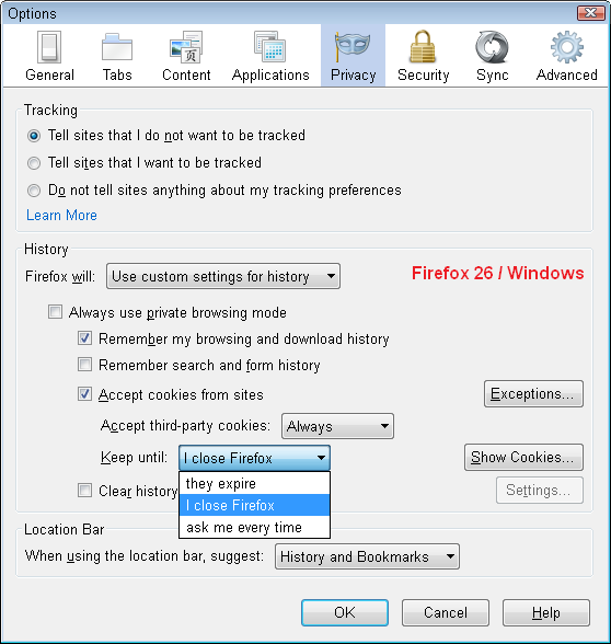 - Tools > Options > Privacy > Cookies: "Keep until": "I close Firefox"